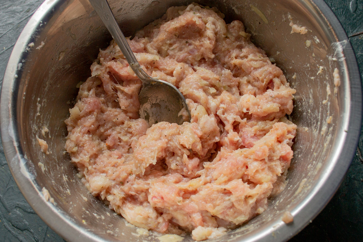 Тщательно перемешиваем фарш, лучше вымесить вручную, как тесто. Готовый фарш оставляем на полчаса на нижней полке холодильника.