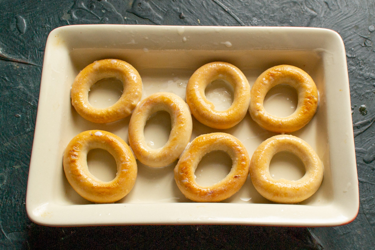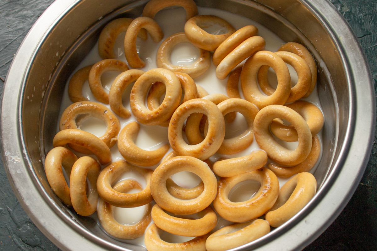 Сушки замачиваем в оставшемся холодном молоке. Периодически перемешиваем, чтобы они равномерно пропитались молоком. Для этого рецепта также подойдут несладкие бублики и баранки, они отличаются от сушек размером и мягкостью, более мягкие изделия быстрее пропитаются молоком.