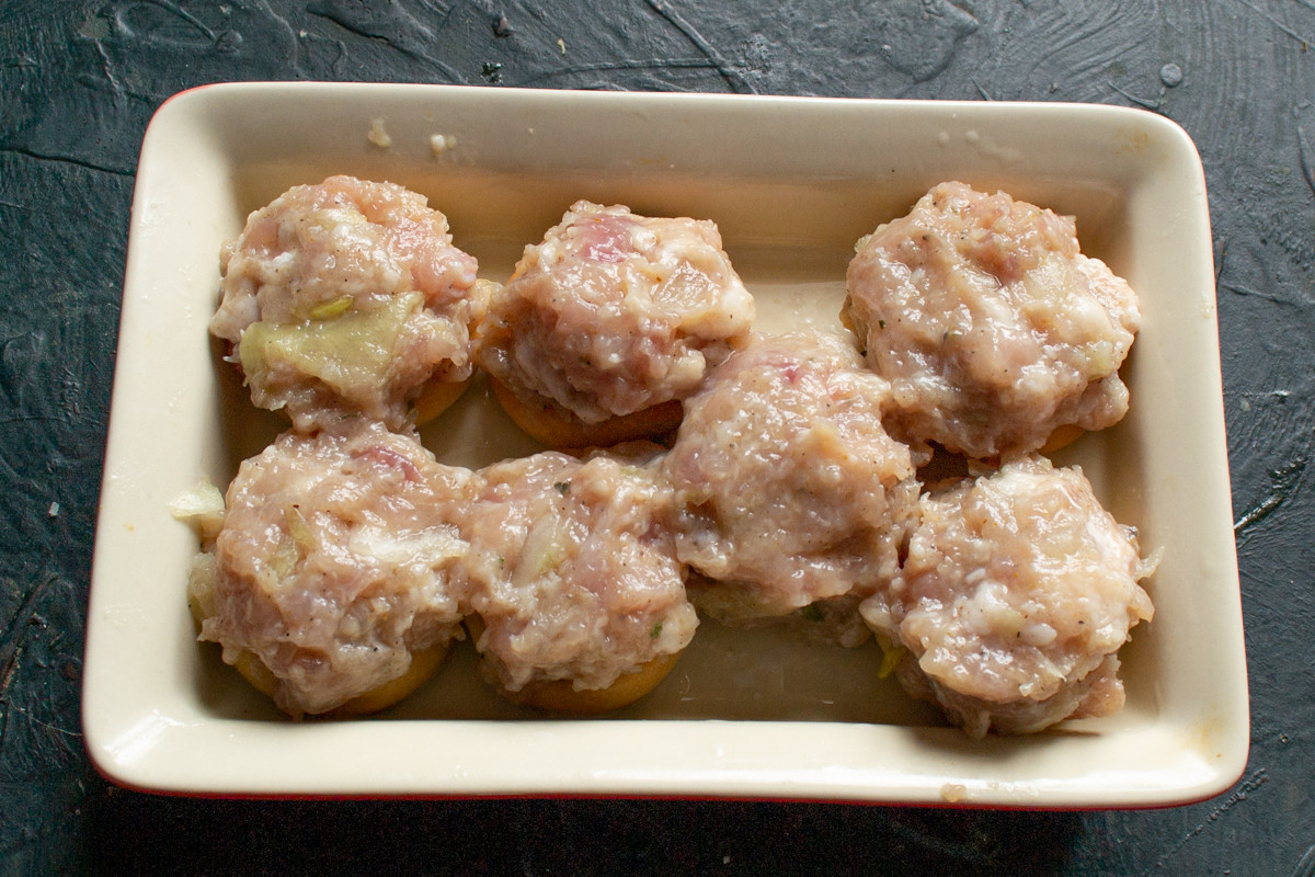 Из фарша скатываем небольшие фрикадельки, вкладываем фрикадельки в сушки.