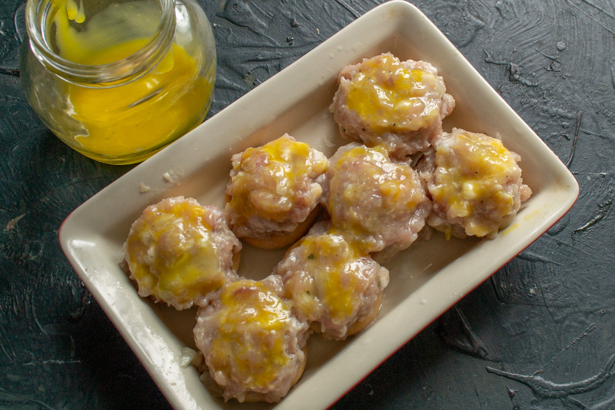 Одно яйцо разбиваем в миску, отделяем желток от белка. К яичному желтку добавляем немного молока, хорошо перемешиваем и смазываем этой смесью фрикадельки.