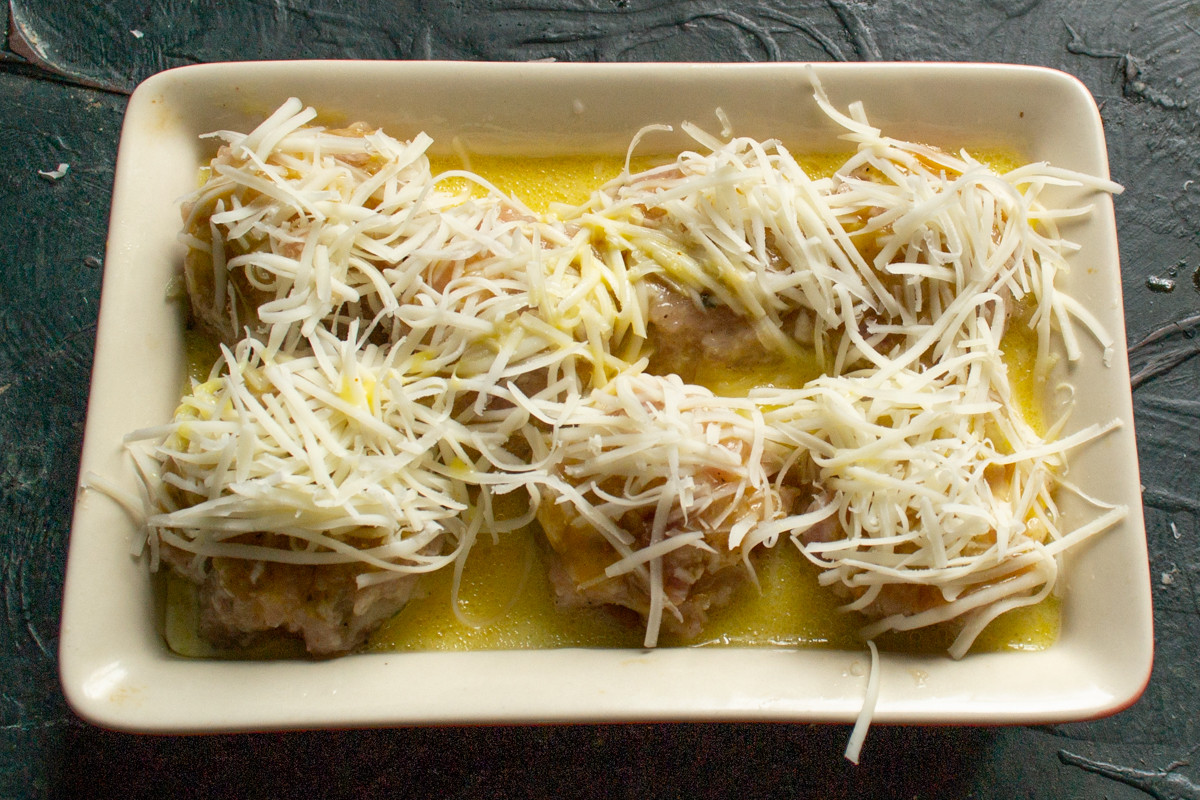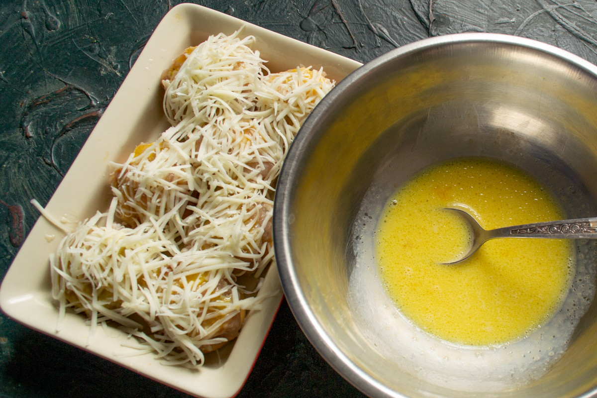 Посыпаем сушки с фаршем тёртым сыром. Оставшееся яйцо, яичный белок и молоко из-под сушек взбиваем венчиком, добавляем растительное масло, солим по вкусу. По желанию приправляем соус молотым черным перцем, паприкой или тёртым мускатным орехом.
