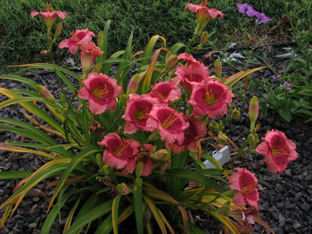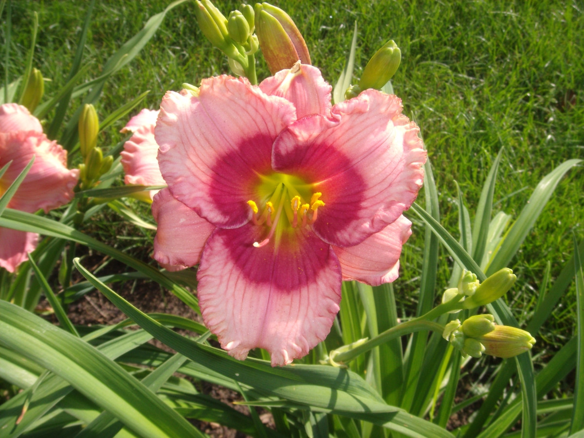 Лилейник «Драгонc Ай» (Hemerocallis ‘Dragon’s Eye’). Цветки светло-розового цвета с большим розово-красным центром, диаметром до 14 сантиметров. Период цветения = июль-август. Не имеет запаха. Предпочитает расти на солнечных местах, но может произрастать и в полутени, где цветёт менее обильно. Любит плодородные хорошо увлажненные почвы. Мало поражается вредителям и болезнями и достаточно морозоустойчивое