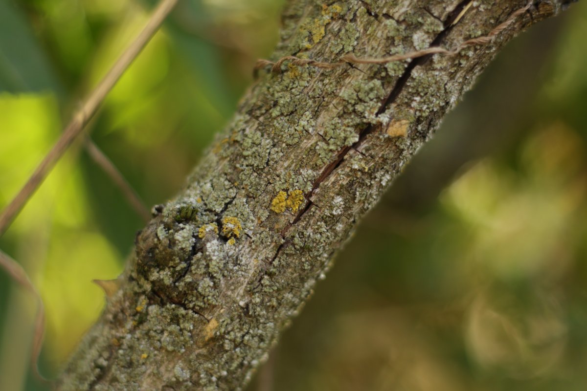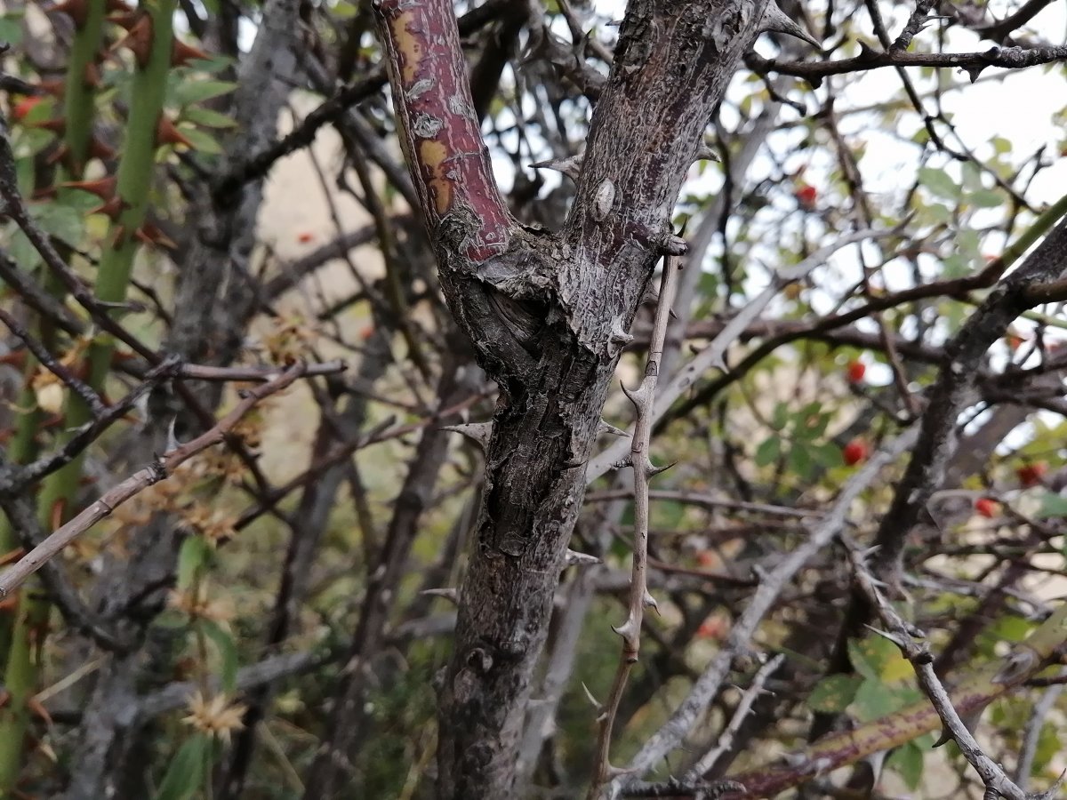 Изначально лишайник появляется на коре шиповника в виде небольших, почти незаметных чешуек. Со временем покрывает все большую и большую площадь. Своим «телом» закупоривает устьица, расположенные на коре. Кроме того, на лишайнике поселяются не только полезные, но и вредные насекомые – клещи, клопы, листоеды.
