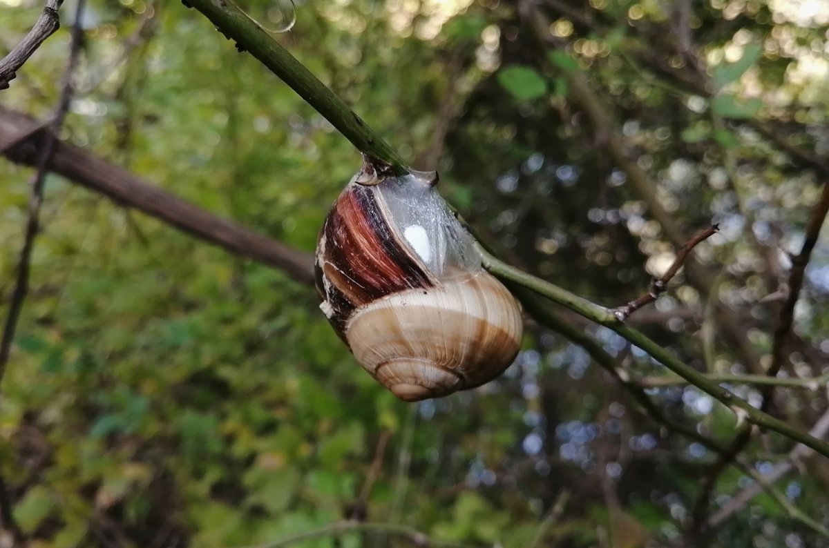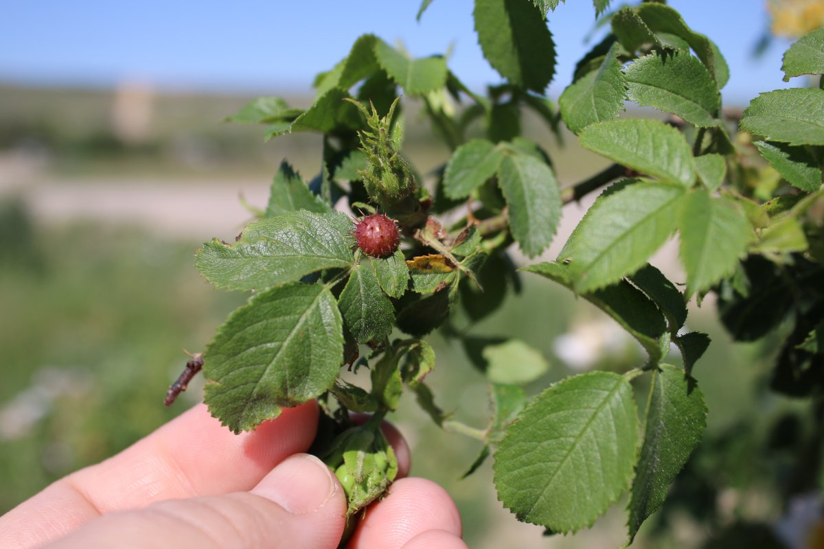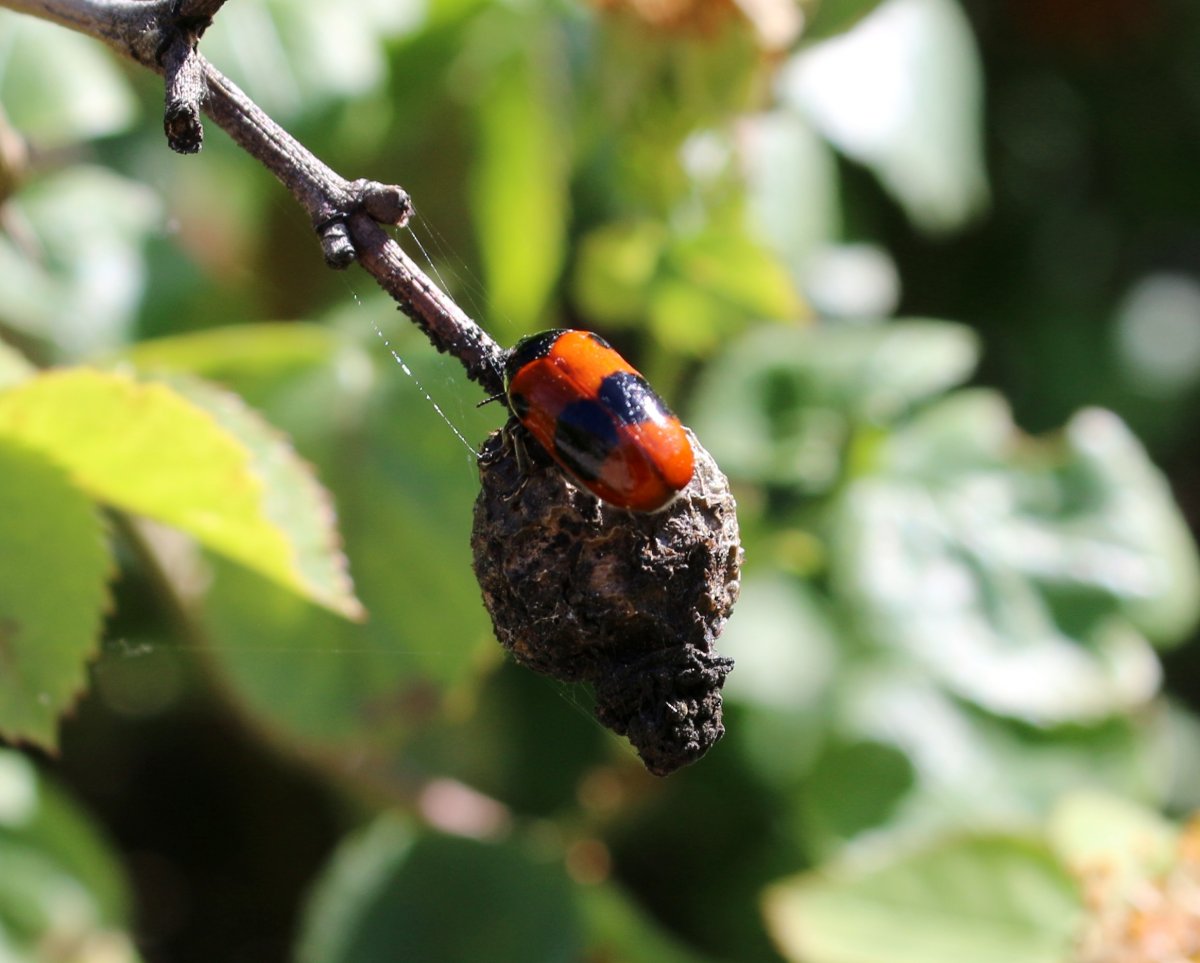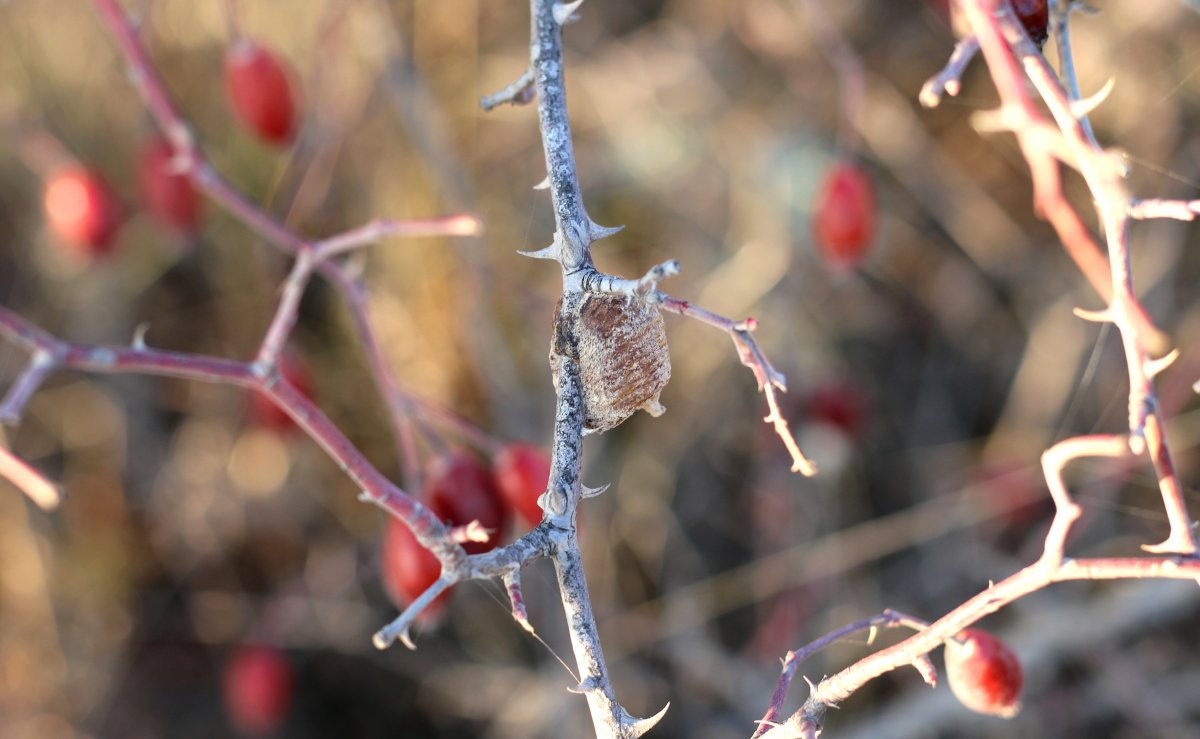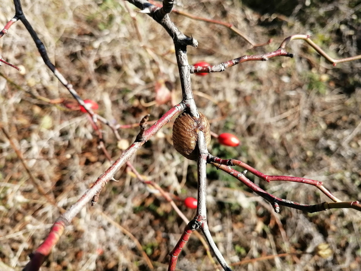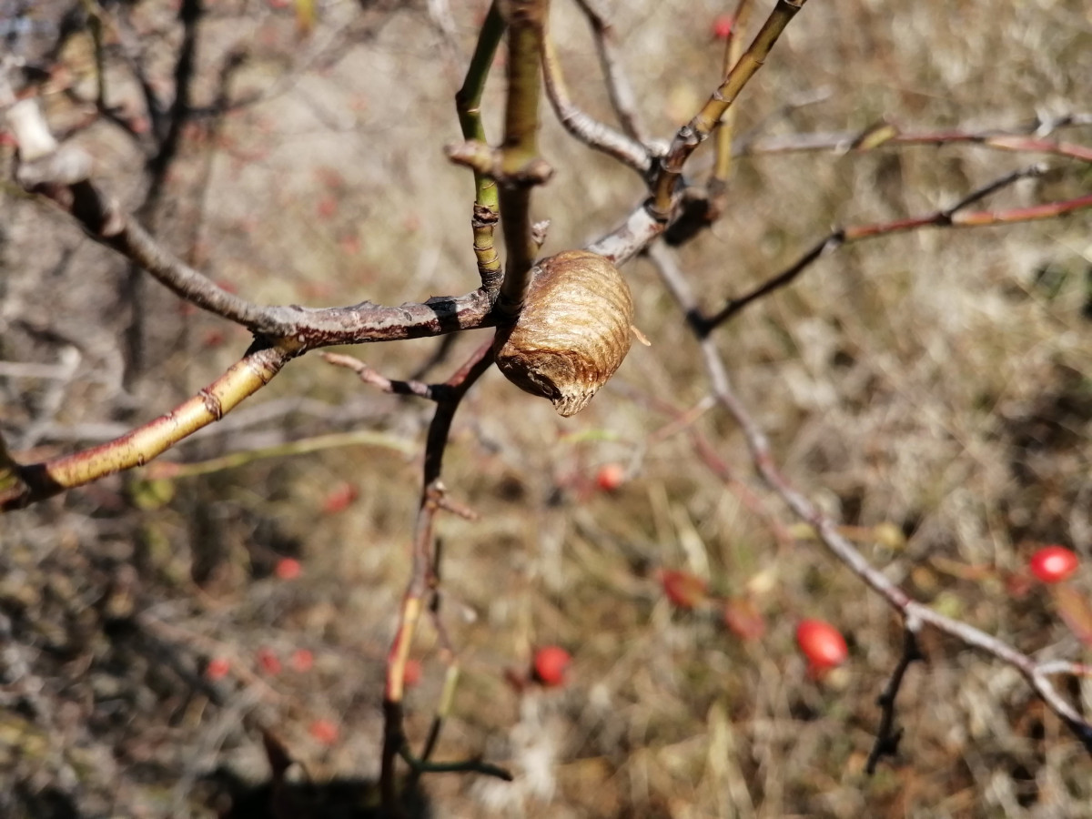 На фотографии оотека богомола (капсула с уложенными рядами яйцами).Крупное, агрессивно-хищное насекомое, поедающее не только вредных, но и полезных насекомых. Окраска варьирует от светло-зеленой, желтоватой до буро-серой, темно-коричневой. Передние конечности приспособлены для хватания пищи, задние бегательные. Не является вредителем шиповника.