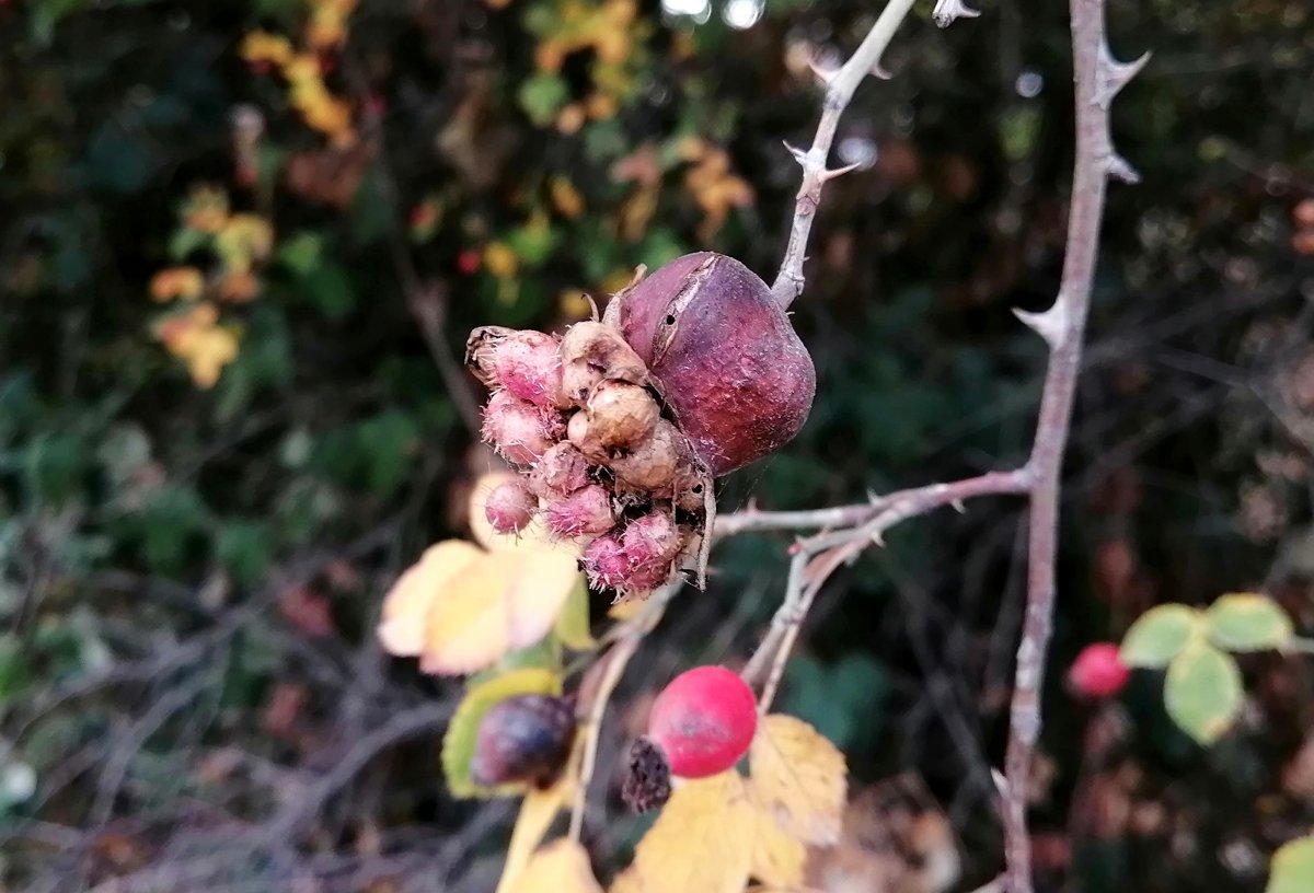Орехотворка розанная — очень мелкое насекомое, длиной около 4 мм. Самки в мае откладывают яйца в почки шиповника, примерно через месяц на листьях и концах побегов появляются галлы, покрытые многочисленными ответвлениями (похожими на волосы). В апреле следующего года из них выходит новое поколение насекомых.