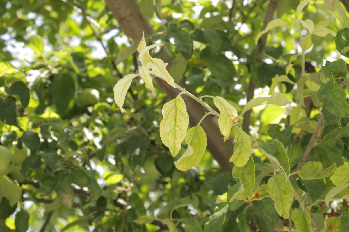 — избытка или сильного недостатка влаги…(Фото: Хлороз вследствие длительного периода дождей сменившихся длительной иссушающей жарой.)