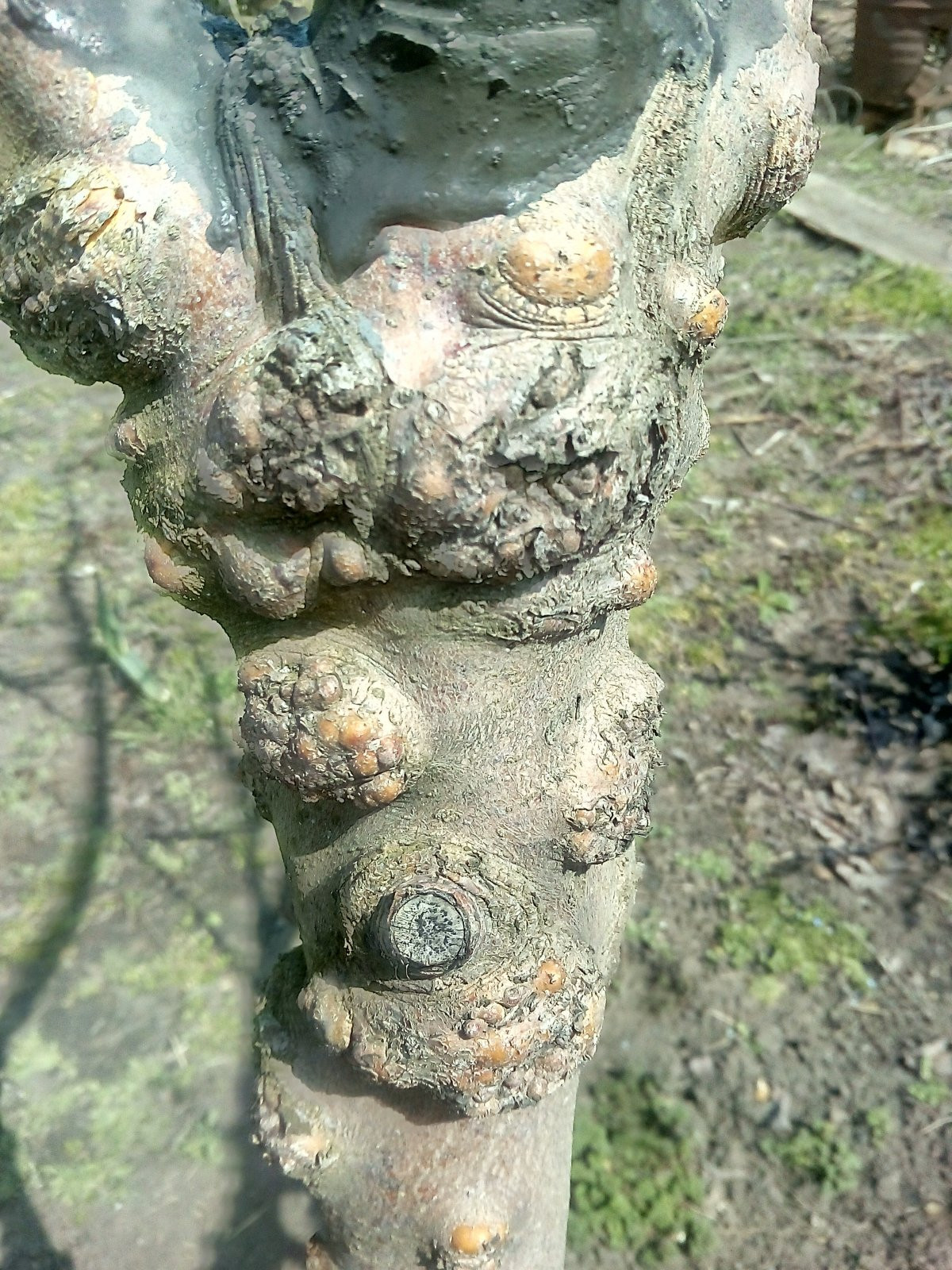 То что происходит с вашей яблоней (дублирую фото) называется бактериальный корневой рак (возбудитель — Bacferium tumefaciens Smith et Iown).Инфекция проникает через раны, но не убивает клетки, а стимулирует их развитие. Израстание тканей может происходить как на корнях так и на стволе.