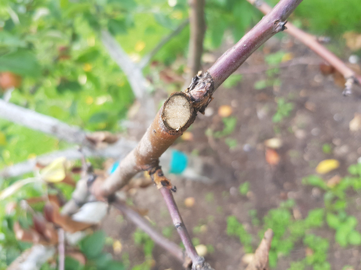 Оксана ГулаМодераторСудя по пятнам и язвам (на первом фото у основания побега, на следующем в районе почки) — это рак. Нужно удалить эту ветвь, чтобы заболевание не пошло дальше.