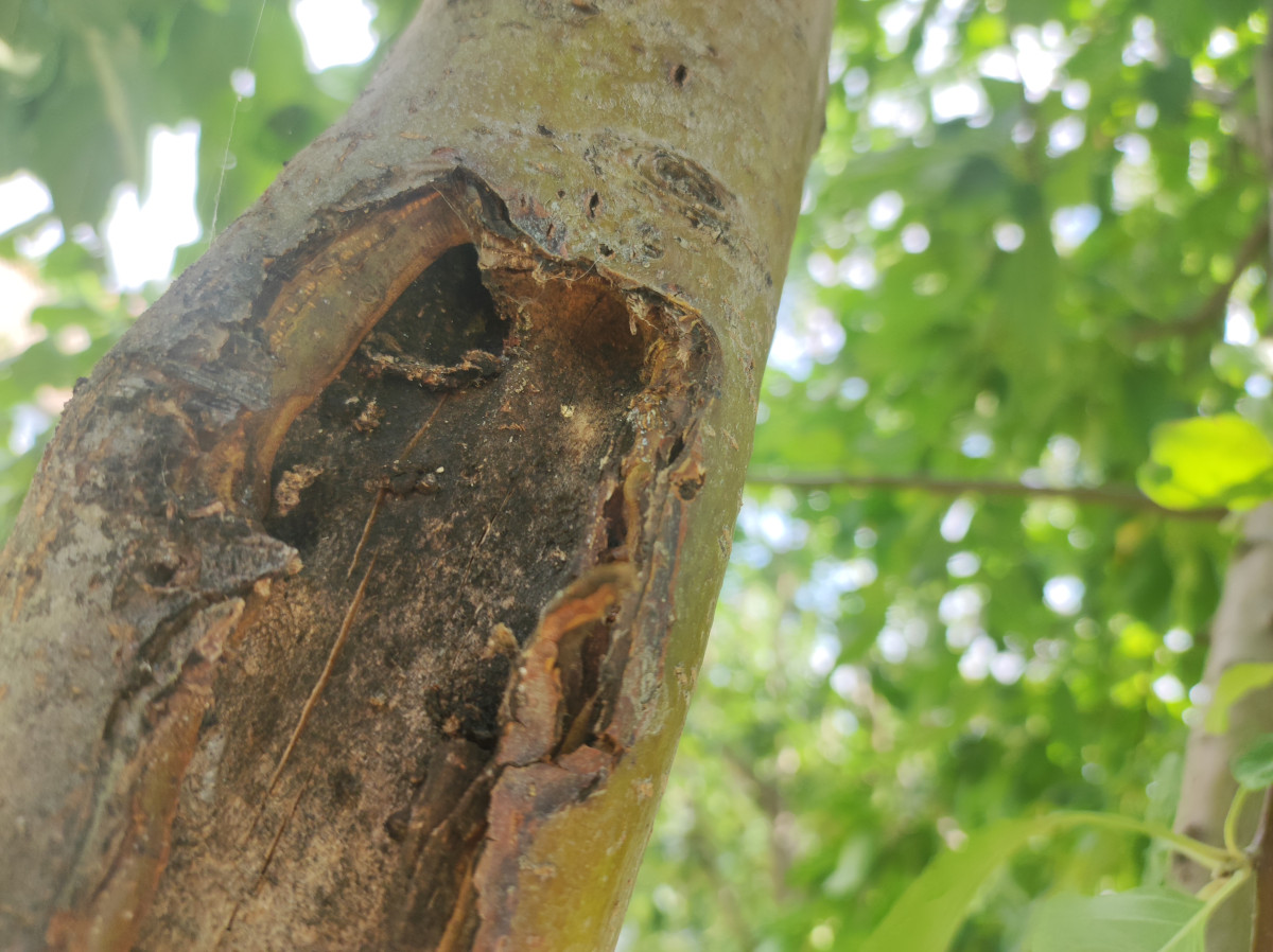 Оксана ГулаМодераторДобрый день, Лиза! Это древоточец. Листва и цветение нормальные до времени. Древоточец точет древесину и со временем ветка начнет отмирать.