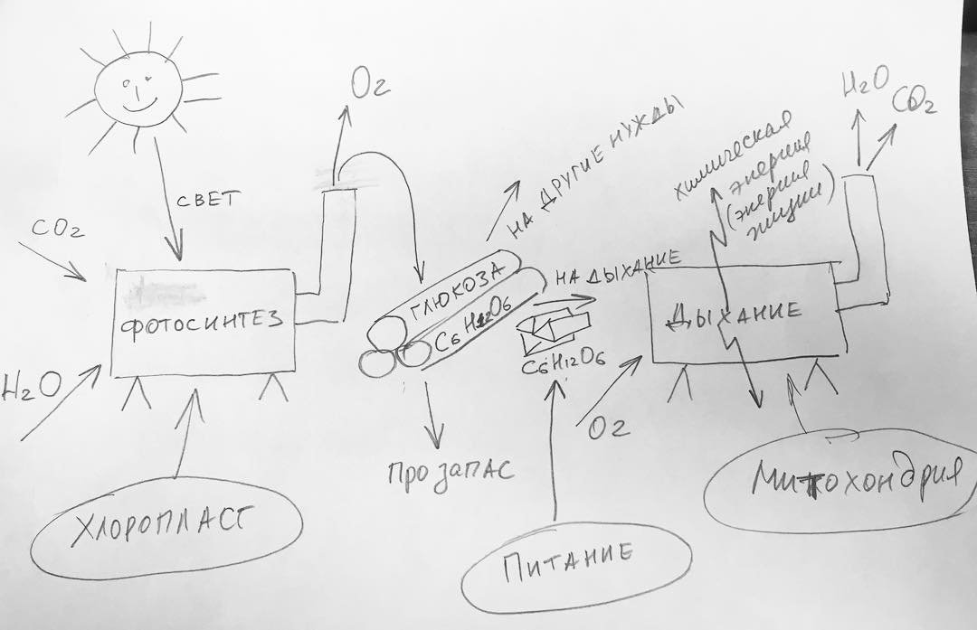 К нам в организм питание поступает извне, при приеме пищи. Растения получают питание из особых компартментов (отделов) клеток листьев и неодревесневших зеленых стеблей – хлоропластов. В хлоропластах находится зеленый пигмент хлорофилл, который улавливает энергию солнечного света. Эта энергия используется для синтеза глюкозы из углекислого газа и воды с образованием побочного продукта – атомарного кислорода. Далее этот кислород должен быть связан в молекулярный, всем нам известный О2.