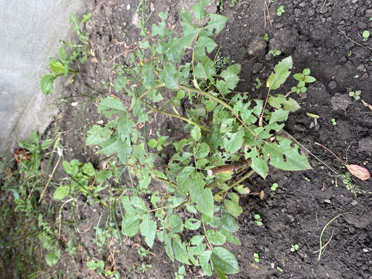 На втором — розу ест пчела листорез и еще что-то. Побеги ослеплены, видимо растение пережило стресс. Нужно взять секатор и обрезать веточки, чтобы обновить точку роста. Просто срежьте прямо сейчас, утром или вечером, над вторым (считаем сверху) листочком, на 1 см выше черешка листа. И удобрить — почва видимо бедная, в посадочную яму не вносился навоз. Значит удобряем сейчас — «роза — дитя навоза». Можно навозом, можно минеральными удобрениями.