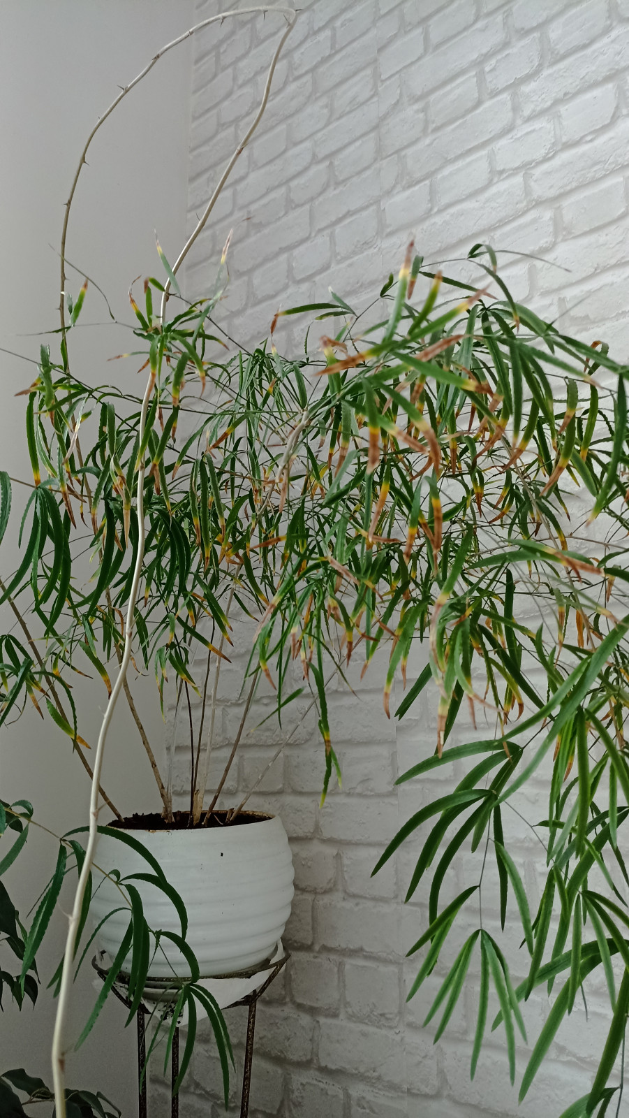 Ваше растение очень похоже на аспарагус серповидный (Asparagus falcatus). Его легко узнать по тонким, длинным побегам и серповидным листьям, которые на самом деле являются видоизменёнными стеблями. Это очень выносливое растение, но пожелтение листьев, как на фото, может быть связано с несколькими факторами: