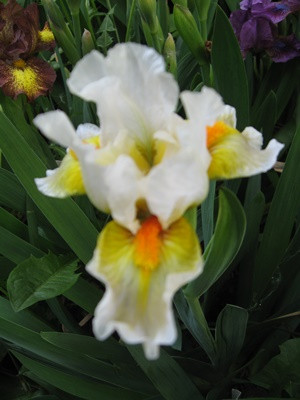 Изящный вариант карликовой формы высотой 25-30 см. Крупные цветы состоят из верхних белоснежных красиво закрученных лепестков и нижних кружевных фол с ярко-желтым сетчатым центром, оранжевой бородкой и белым волнистым краем. Цветение раннее с конца мая и весь июнь. Обладает отличной зимостойкостью.