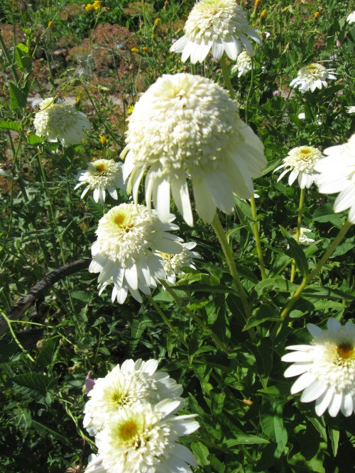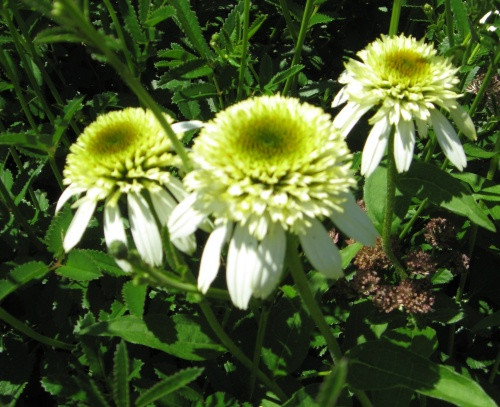 Высокие кусты достигают 90см. Мощные стебли хорошо ветвятся, образуя новые побеги. В пятилетнем возрасте на одном растении насчитывается около 100 махровых белых соцветий с желто-кремовой серединой. Они не теряют декоративности на протяжении 2 месяцев. Нижние лепестки смотрят вниз. В процессе распускания бутонов «шапочки» вытягиваются, образуя конус бледно-салатового оттенка. Обладают высокой морозостойкостью до -35 градусов. Цветение продолжается с июля по сентябрь.