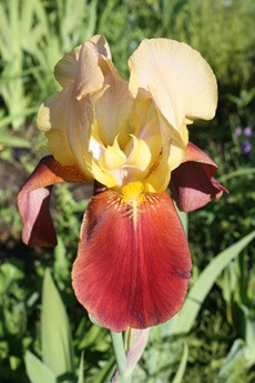 Германский бородатый ирис, отличающийся крепкими высокими (90-100 см) цветоносами, формирующими от 1 до 7 бутонов. В одном цветке собрана разнообразная гамма оттенков: жёлтый, кремовый, розоватый, бордовый, коричневый. Бархатные лепестки имеют гофрировку по краю, верхние более светлые, нижние тёмные. Бородка ярко-жёлтая красиво смотрится на бордово-коричневом фоне. Бутоны обладают нежным ароматом, распускаются в мае-июне, размером до 15 см.