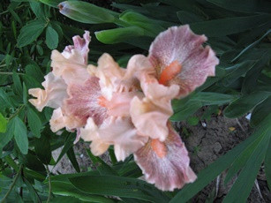 Необыкновенно красивый ирис высотой 30 см абрикосово-розовой расцветки с бородовыми точками, расположенными хаотично по всей поверхности леместков, с однотонной волнистой окаёмкой, красно-коралловыми бородками. Срок цветения средне-ранний.