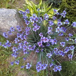 Узкие тёмно-зелёные листья напоминают дикие ирисы. Высота растений 15-20 см. В июне покрываются васильковыми нежными соцветиями, напоминающими звёзды. Особенно эффектно смотрятся взрослые кустики с множеством голубых бутонов. Быстро разрастается, образуя плотные кустики.